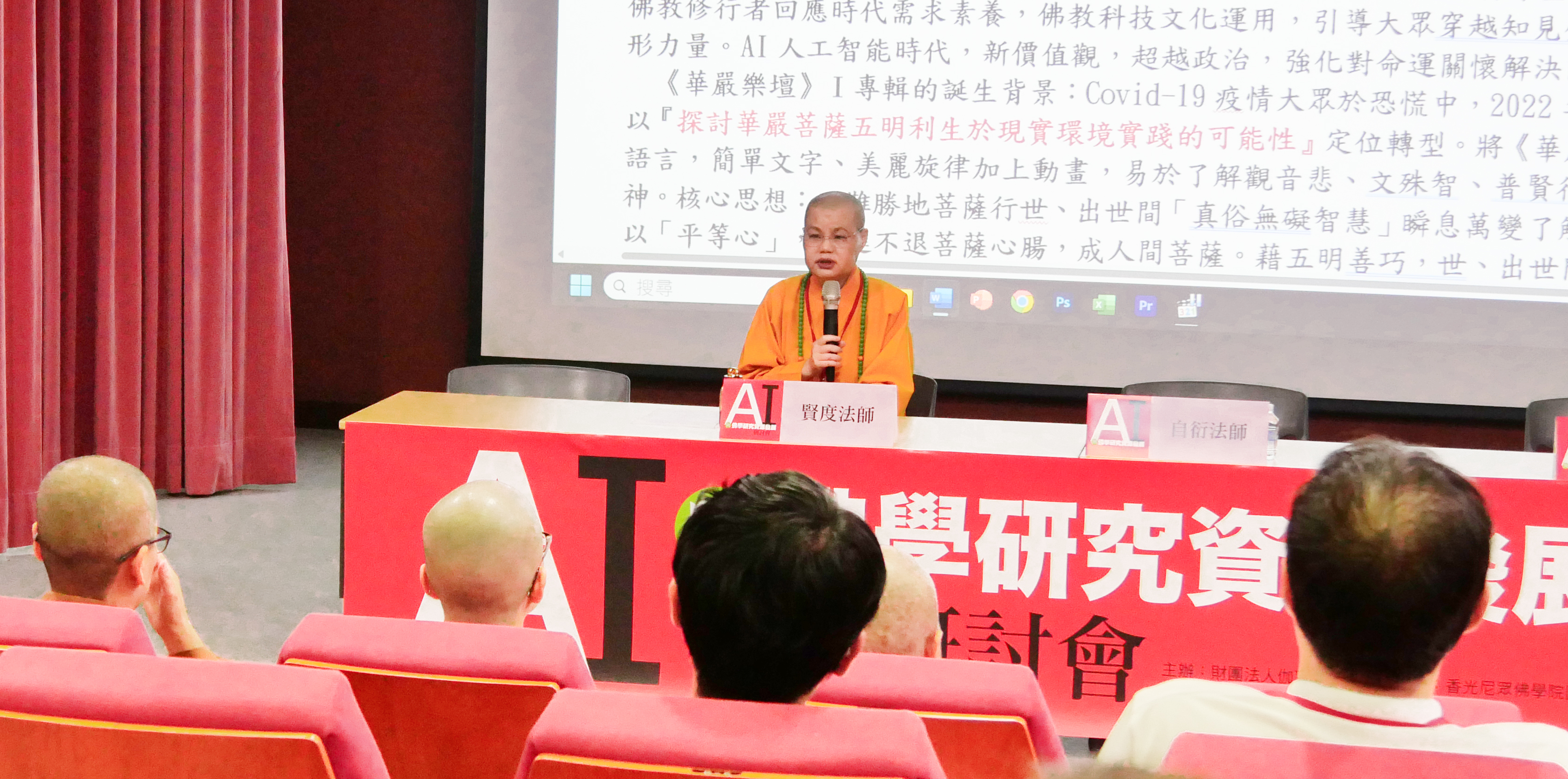 10月24日上午9點,財團法人伽耶山基金會舉辦「AI 與佛學研究資源發展研討會」,假國立臺灣大學圖書館國際會議廳隆重舉行。臺北華嚴蓮社董事長賢度法師應邀發表「聽見華嚴、看見華嚴、走進華嚴」,討論AI在佛教弘法上的運用。此次研討會旨在提供一個跨領域的交流平臺,促進佛學與AI 技術的交流與融合,探索數位時代下佛教知識的創新發展;期望集結各界在佛典數位化、語料庫建構與AI 輔助研究上的實踐經驗,拓展佛學研究資源的多元化與功能性,並推動佛教知識共享平臺之建置,以助益佛學研究的轉型與創新。