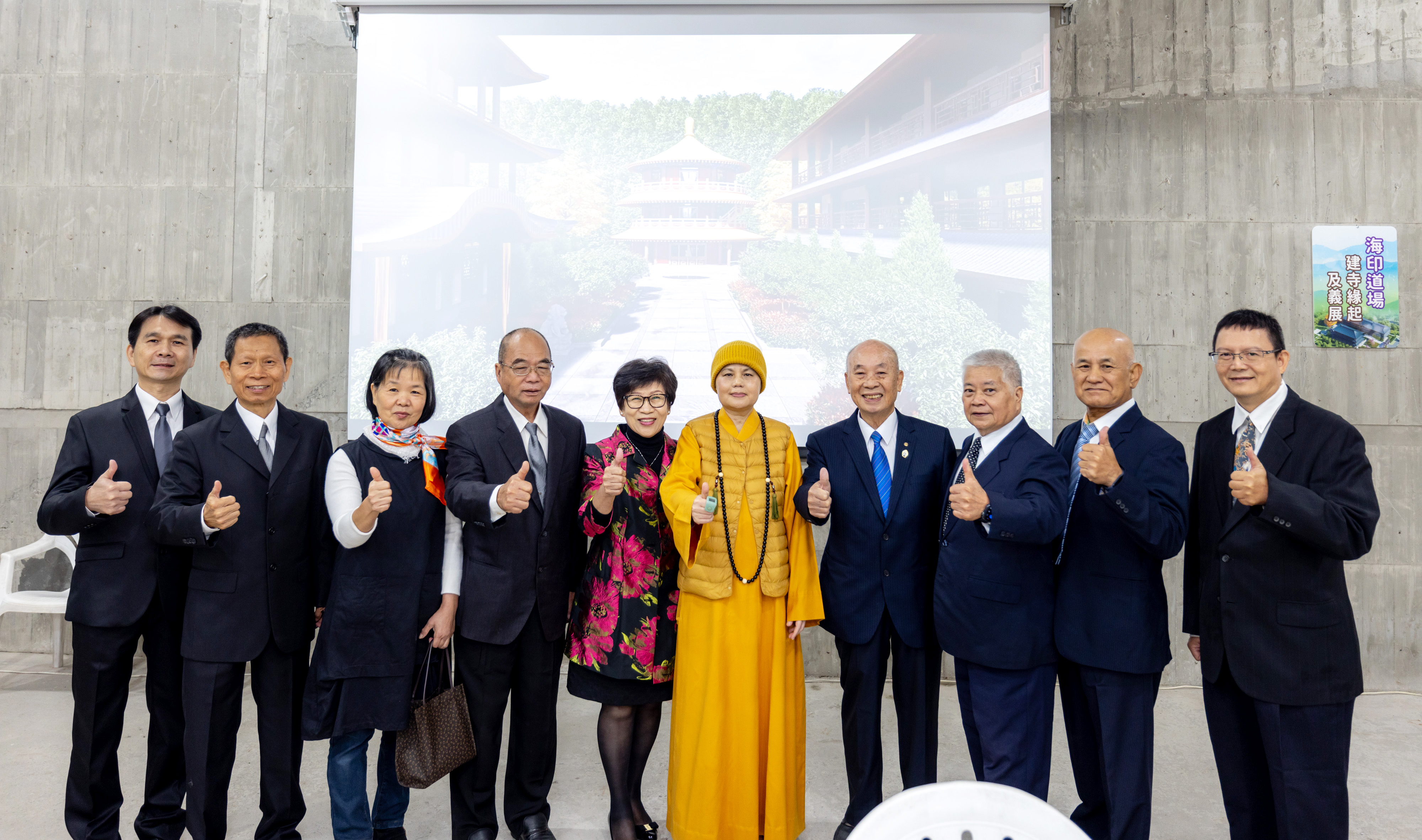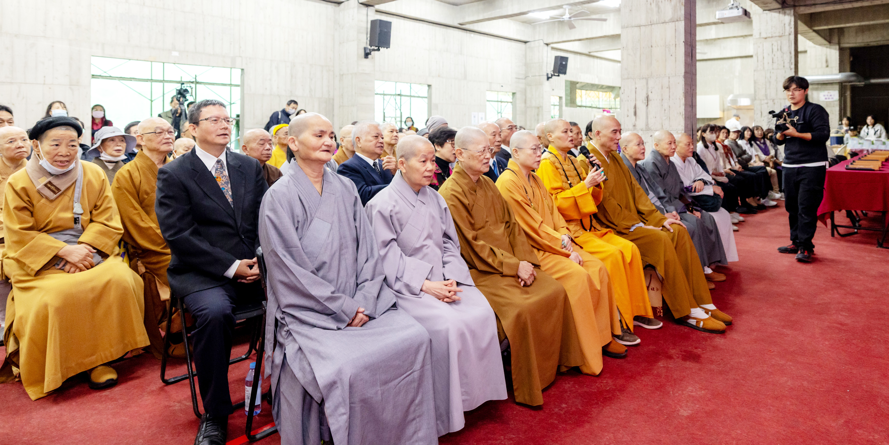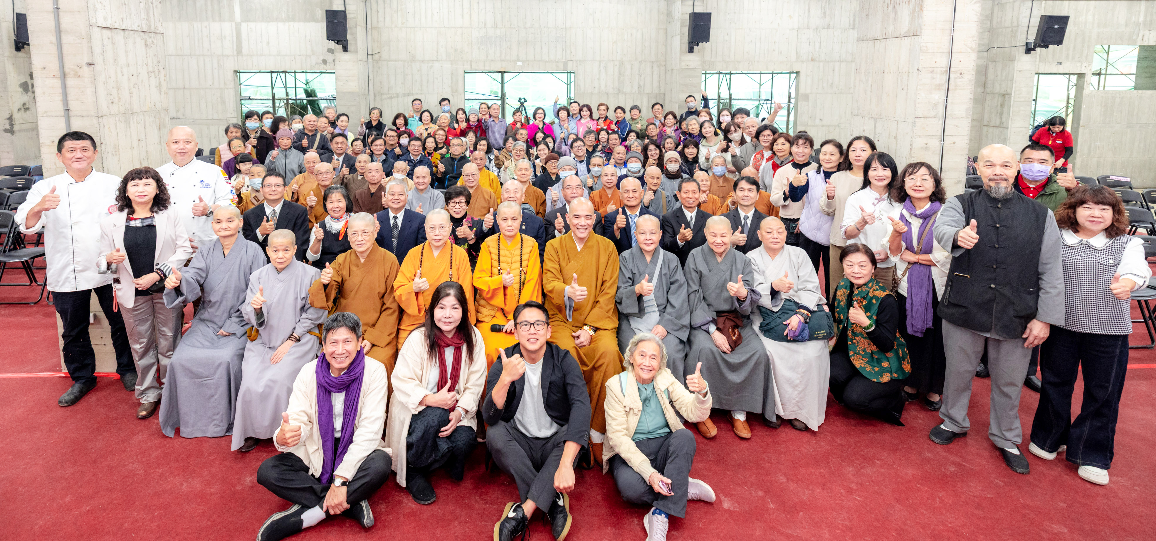 ▲海印永續數位文創生態園區擠入滿滿信眾捐瓦看賢度董事長(坐者第一排右五)其音樂作品(華嚴蓮社提供)