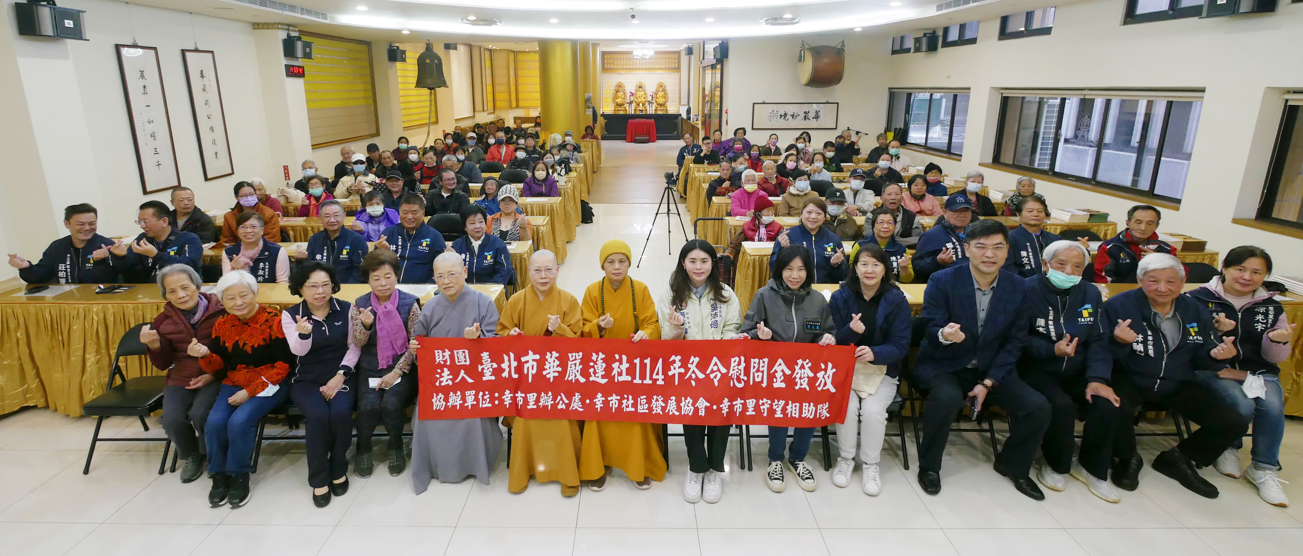 1月20日臺北華嚴蓮社舉辦冬令慰問金活動,出席的有:董事長賢度法師、副董事長天演法師、臺北市中正區公所黃文麗主任祕書、中正一分局陳瑞基分局長、忠孝派出所徐群元副所長、臺北市議會應曉微議員、立法院吳沛立委辦公室黃亭瑋主任、福田功德會組長、幸市里林禎吉里長暨守望相助隊、中正區里長聯誼會陳木松會長暨全體里長。